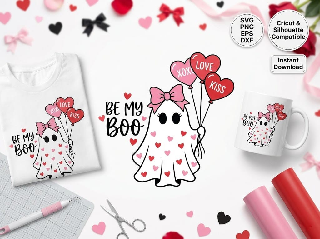 The Valentine Ghost SVG is created with clean vector lines that ensure smooth and accurate cutting. The design scales easily, allowing you to use it for small planner decals or large statement pieces on sweatshirts without losing detail. It is the perfect balance of spooky and sweet.