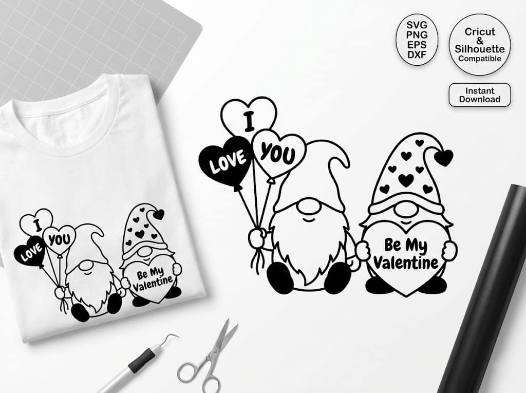 The playful gnome style makes this design especially popular for family-friendly crafts and seasonal décor. You can use it to create Valentine t-shirts, custom coffee mugs, and cheerful greeting cards. It allows you to express love in a fun, lighthearted way.