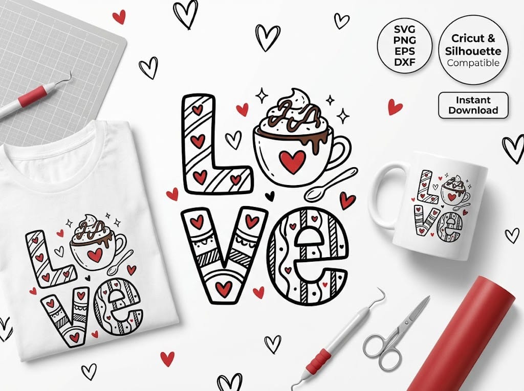 If you sell handmade products online or at local markets, this Valentine Love Coffee SVG can help you create unique designs that customers adore. Coffee-related products perform especially well during Valentine’s Day and the winter season.